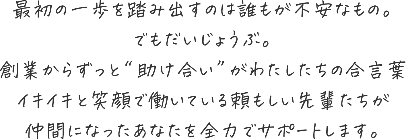 現在のスタッフは20 代~40代が中心なので、先輩に気軽に質問したり教えてもらったり出来る雰囲気の職場です。