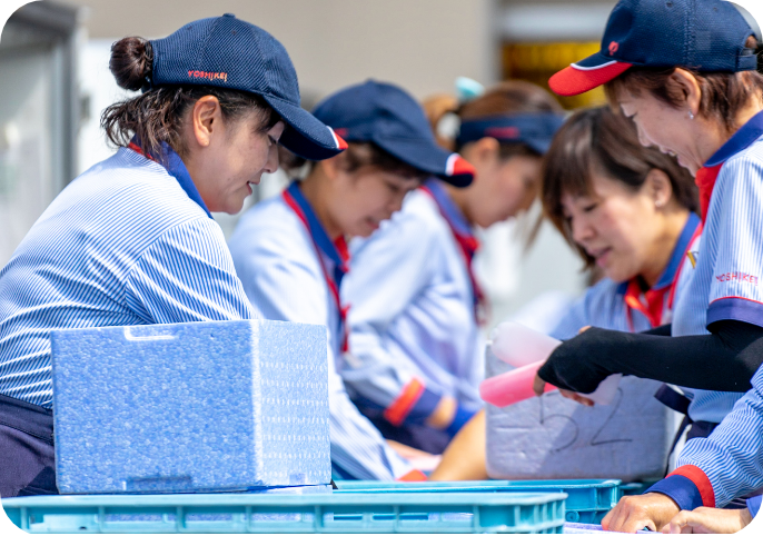 営業所では、各ご家庭に食材を配達する20名前後の女性ドライバーたちが待ち受けています。到着したら、全員で荷降ろしを開始します。